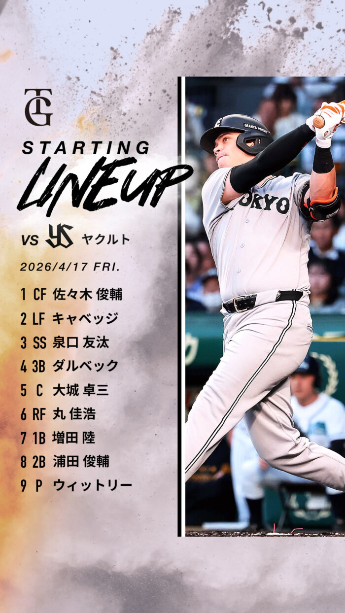 巨人スタメン ヤクルト戦(神宮) 1番佐々木 俊輔、2番キャベッジ、3番泉口…